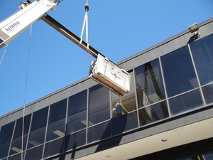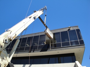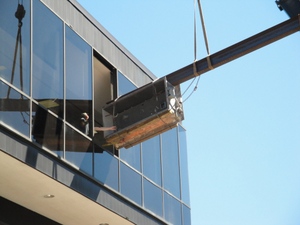 We removed an appropriate window, and called in the cranes.